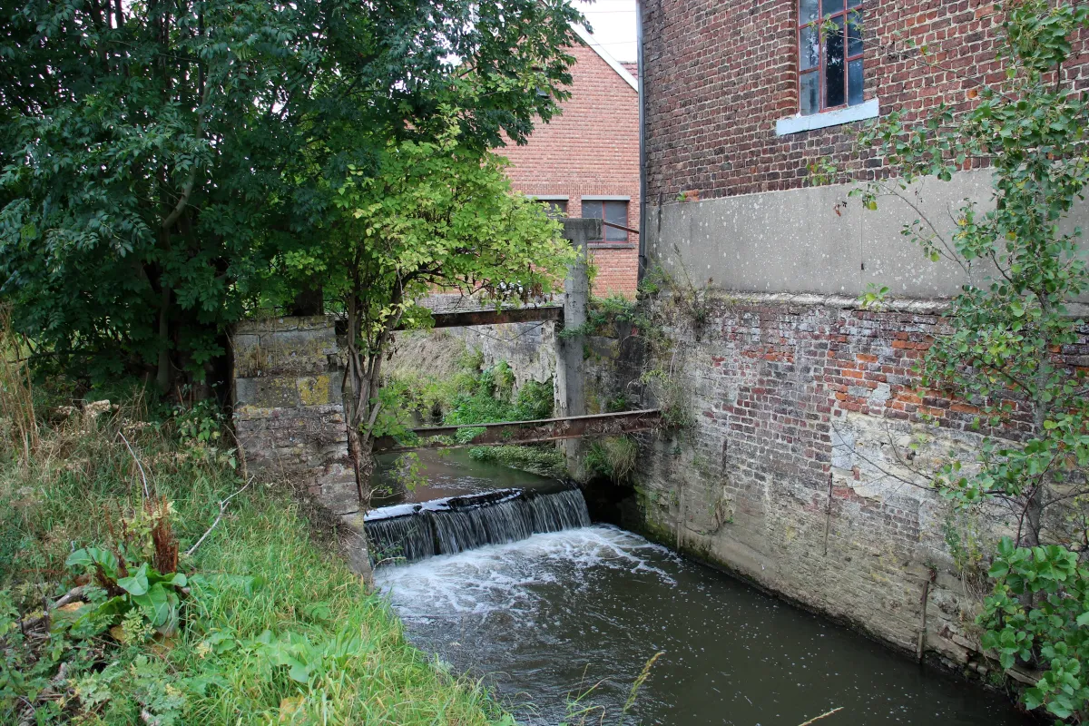 - Bakstenen gebouw, dwars op de waterloop