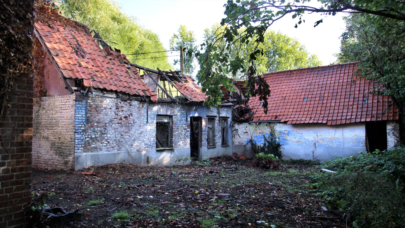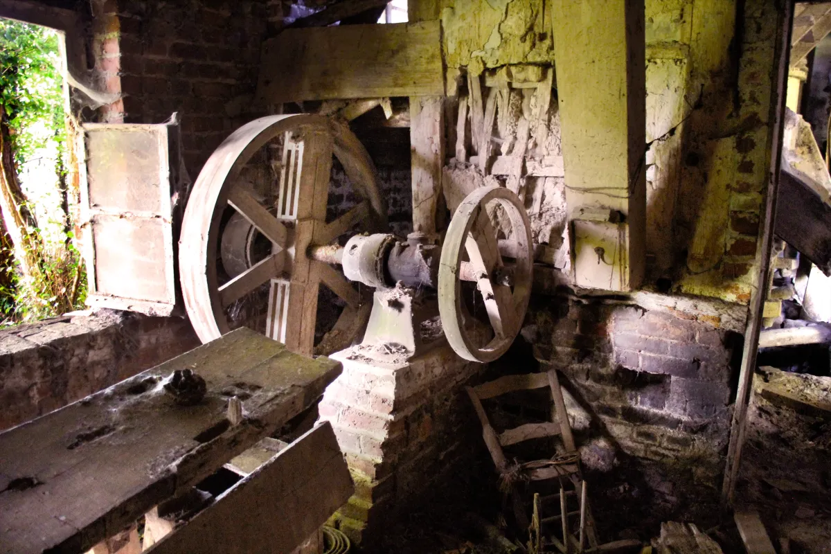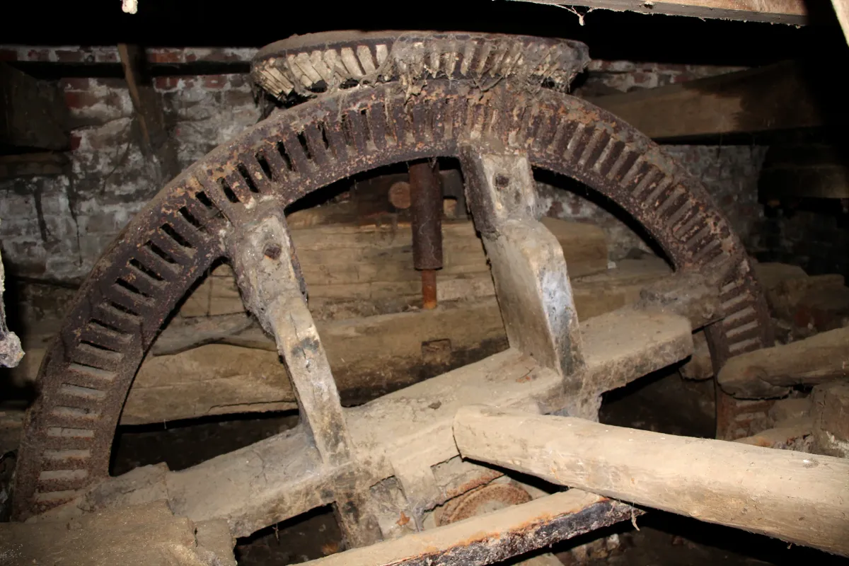 Het verroeste metalen bovenslagrad en het binnenwerk zijn verwijderd. Het gebouw staat leeg.