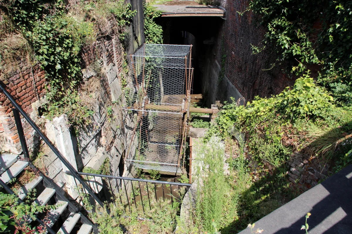 - Gietijzeren drijfwerk onder afdakje (nog aanwezig)