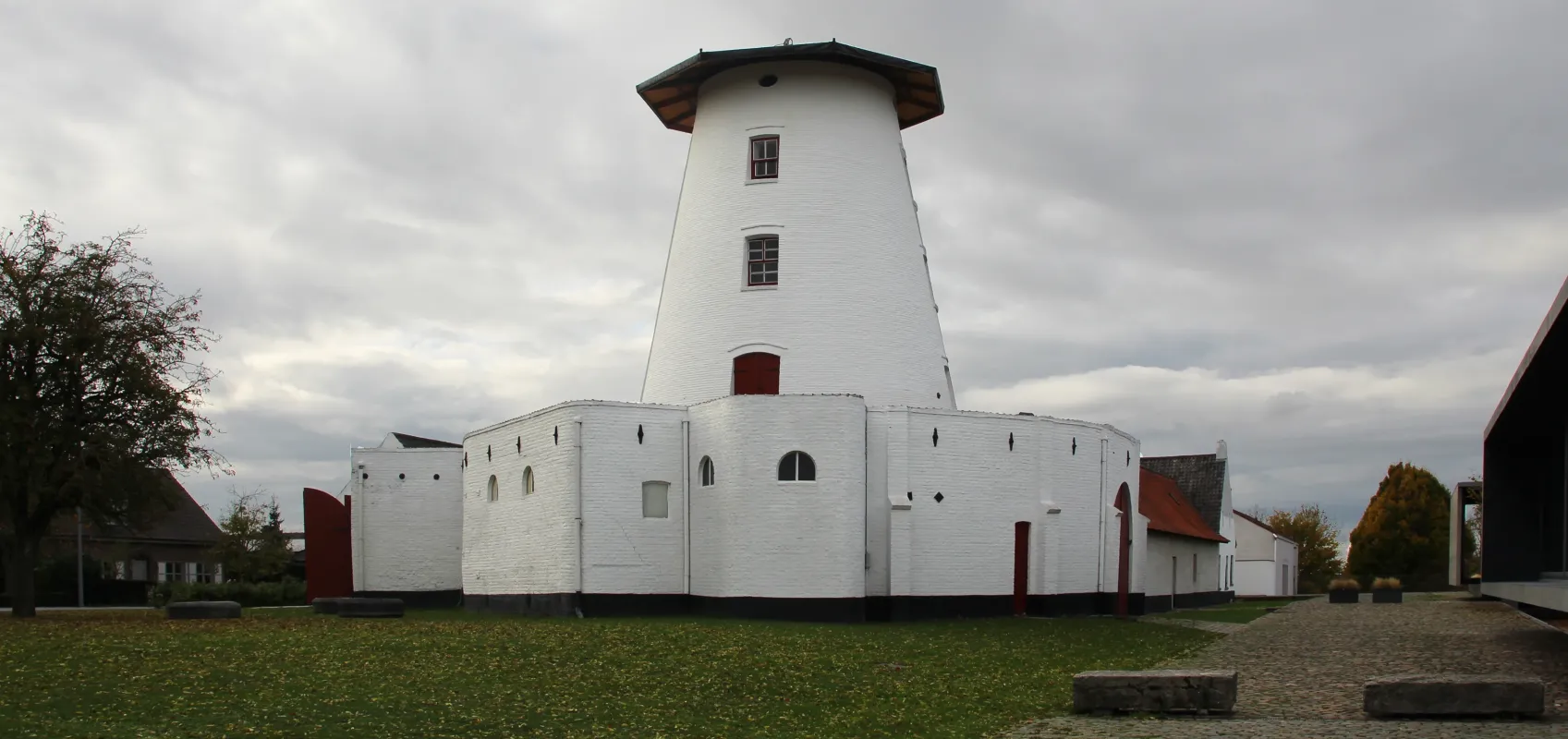 Witgekalkte konische bakstenen molenromp met typerende boven elkaar gestelde steekboogvensters en vier ovale vensters op kapzolder.