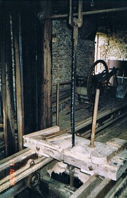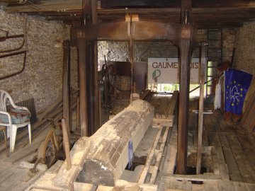 la première roue à aubes droites installée au XVIe. siècle afin d’actionner le moulin à poudre, c’est une roue à aubes concaves qui permit à la scierie de fonctionner, dès le siècle dernier. Cette dernière entraînait une scie à cadre, une scie circulaire ainsi que des raboteuses et mortaiseuses. Cet ensemble de machinerie permit aux menuisiers, charpentiers et particuliers de la région jusqu’en 1968 quand le dernier propriétaire Jean Naisse cessa toute activité.