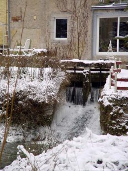 De eerste dam met sluiswerk die een 150 meter stroomopwaarts staat om de voorloop van de molen te voeden is dringend aan herstel toe. Het sluiswerk aan de molen zelf is nog in behoorlijke staat.