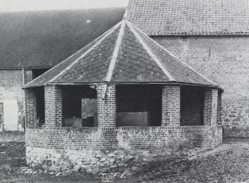 Rechtover het poortgebouw staat een langse schuur: de muur is gemaakt uit bakstenen gemetseld boven een blokstenen grondmuur en plint. Tegen deze schuur staat een halfronde manege-dorsvloer. Hij is gevormd door een lage bakstenen muur, eveneens opgericht op een basis gevormd door blokstenen. Een zestal vierkante pijlers uit baksteen dragen het in 2007 prachtig gerestaureerde leien dak.