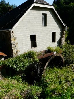 Het natuurstenen gebouw (de molen in het verlengde van het woonhuis) is nog in goede staat. Het metalen bovenslagrad is verroest.