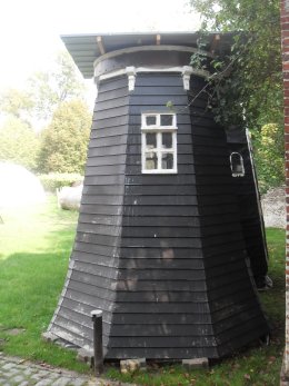 Kleine achtkante houten stellingmolen gebouwd naar het model van een Hollandse achtkant; zes meter hoge achtzijdige bakstenen voet met houten gaanderij.