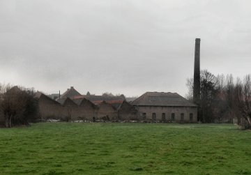 Erachter, over de Molenbeek gelegen voormalige blauwververij "De Wolf frères" met incorporatie van de oude watermolen. Nu volledig in puin. Bewaarde ronde fabrieksschoorsteen van 1900.