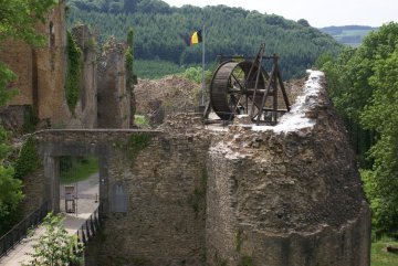 Toeristisch nagebouwde tredmolen- kon 3000 kg hijsen. Deze kraan werd meestal bediend door één of twee vrouwen of twee kinderen. Soms deden ook gehandicapte mannen - die echter nog over hun twee benen en hun volledige loopvermogen beschikten - dit werk. Door het verliezen van (het gebruik van) hun arm(en) of hand(en) veloren zij ook hun werk en dus hun inkomsten, maar dankzij dit soort raderen konden zij (gedeeltelijk) verder voorzien in hun levensonderhoud.