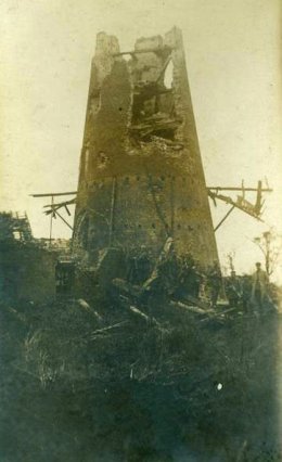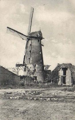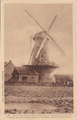 Duitse prentkaart, verzonden op 15.12.1917, ook afgedrukt in Berliner Illustr. Gesellschaft, met als bijschrift 288. Eine Windmühle bei Dixmuiden, die von zahlreichen feindlichen Granaten getroffen wurde. Vorne ein mit Wasser gefühltes Geschoβloch.