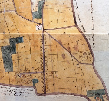 Rijksarchief Kortrijk, Gemeentearchief Hulste, nr. 81: Caerte figurative van het sesde deel der prochie van Hulste van westen de prochie van Lendelede en suyd noort en oost de straete comende van Lendele en loopende so oost waert naer de Groote heirbaene van Cortryck op Thieldt..., in Lantbouck ende afmetinghe der prochie van Hulste, Pieter Stueperaert, 1716.