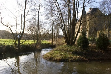 Le moulin se positionne à l'extrémité d'une longe dérivation qui suit la rive droite, alors que le cours principal décrit plutôt ses méandres du côté de la rive gauche. Curieusement, deux courants d'eau contribuent à l'alimentation de cette dérivation. Le premier se détache du cours principal à hauteur du passage dit "sentier de la Gare". L'autre (peut-être dans les restes d'un ancien lit) se rattache au cours principal de l'Eau d'Heure à plus d'un kilomètre en amont (emplacement d'une vanne). L'existence de cette seconde branche de la dérivation tient probablement à la présence d'un ancien tordoir à hauteur du chemin de Hameau, dans le secteur de la gare. On trouve d'ailleurs là un autre point traditionnel de traversée de l'Eau d'Heure