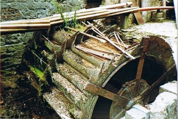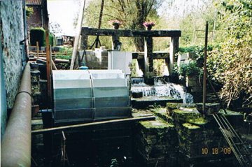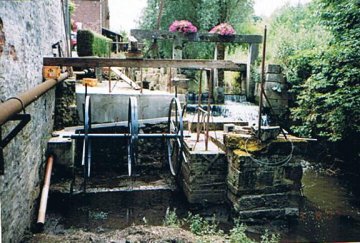 Les vannes permettant le contrôle du débit de la rivière et l'alimentation réglée de la roue exisent toujours dans le prolongement de la façade principale.