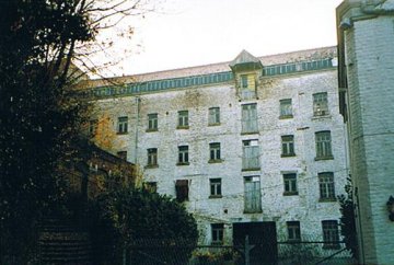 En retrait dans une cour, bâtiment de meunerie de la fin du 19e siécle, en briques peintes, sur quatre niveaux, intégrant au rez-de-chaussée à gauche une porte cochére plus ancienne, murée.