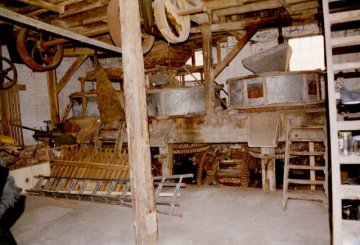 Bewaarde maalderijinrichting met drie molenstoelen met meelschuiven en molenstenen op een hoge stelling, met daaronder een zwaar ijzeren aandrijfmechanisme van tandwielen en aandrijfriemen, -wielen en –assen en de mechanisch aangedreven grenenhouten builmachine van C. Duchamp (Brussel). Verbouwde stookplaats. Verdwenen stoommachine, nu opgesteld in de Bakkersmolen te Essen-Wildert.